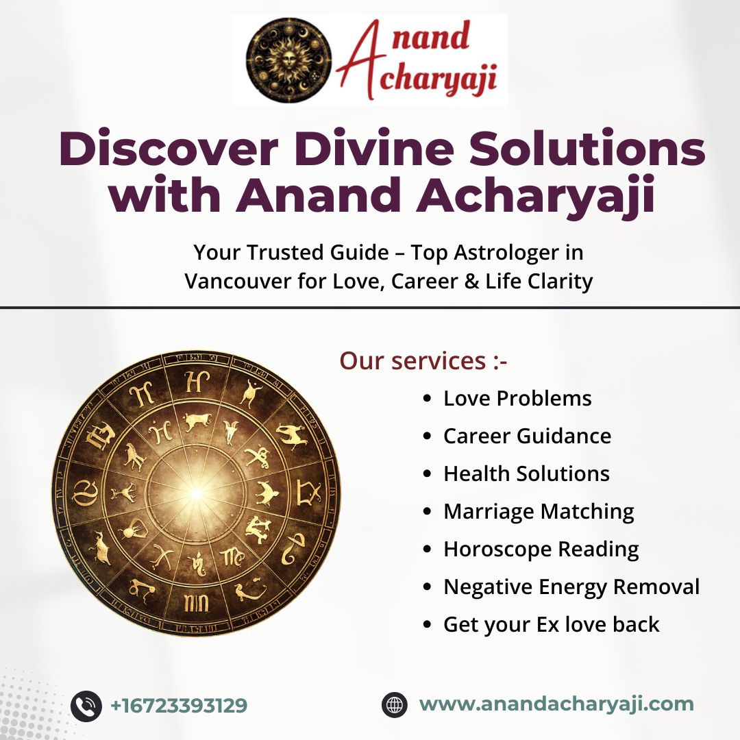 Experience powerful astrological solutions with Anand Acharyaji, the Top Astrologer in Vancouver. Whether you're facing love issues, career confusion, or family troubles, get accurate guidance through horoscope reading, marriage matching, vastu tips, and more. Let the stars light your path to success and peace.